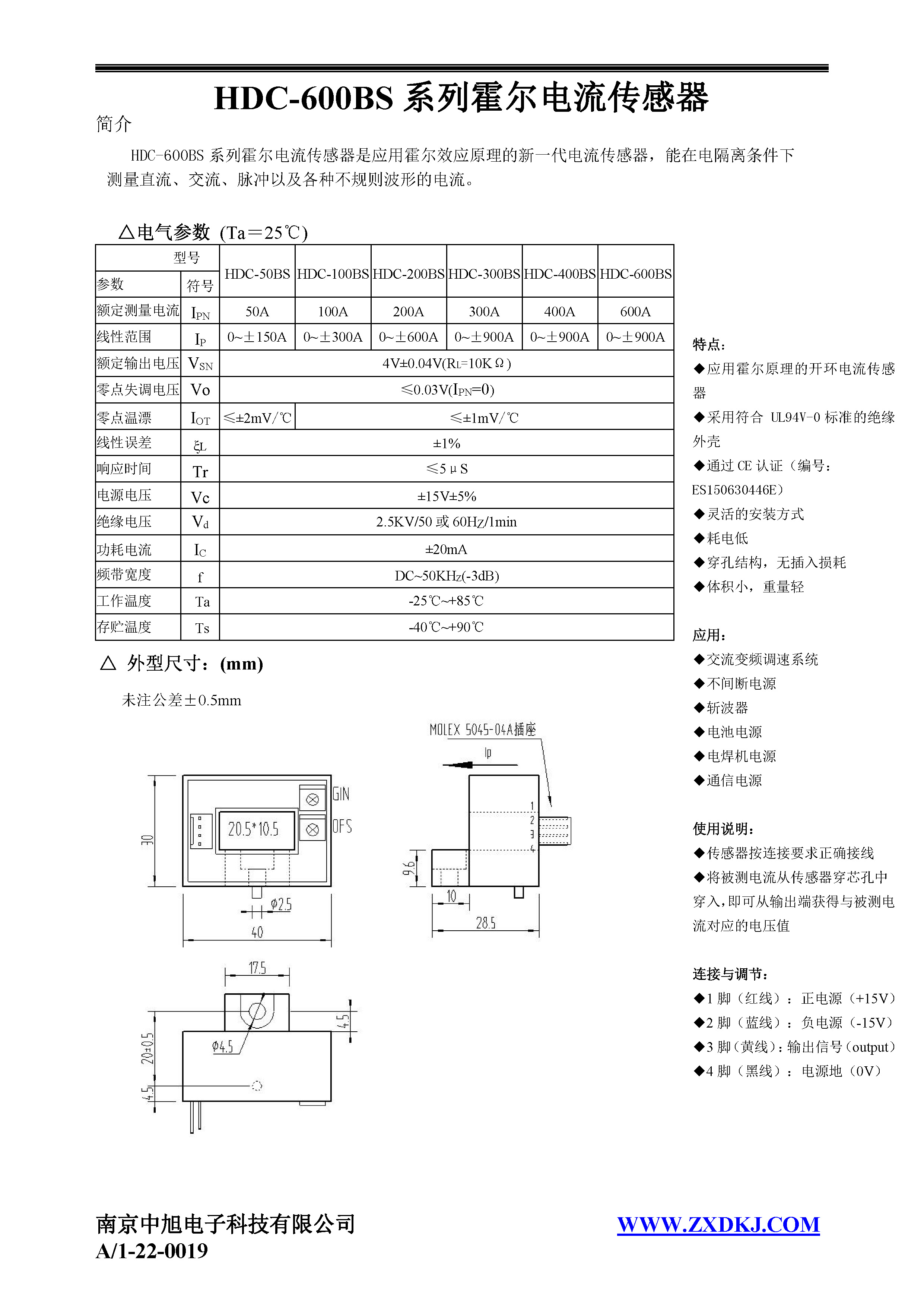 HDC-600BS系列霍爾電流傳感器是應用霍爾效應原理的新一代電流傳感器,能在電隔離條件下測量直流、交流、脈沖以及各種不規(guī)則波形的電流。