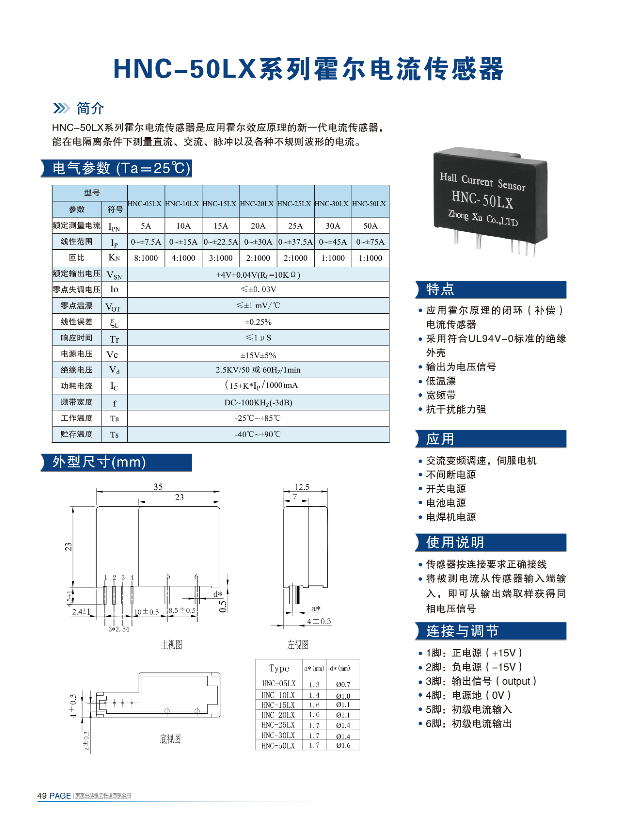 HNC-50LX系列霍爾電流傳感器是應(yīng)用霍爾效應(yīng)原理的新一代電流傳感器,能在電隔離條件下測量直流、交流、脈沖以及各種不規(guī)則波形的電流。